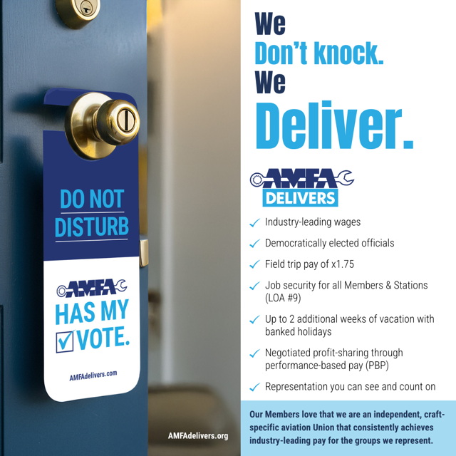Check out our new site, AMFAdelivers.org, to get the facts on AMFA, IAM and the representation process and voting. AMFAdelivers.com is accessible to the public, so please share it with friends, colleagues and anyone at Hawaiian who may be interested in learning about what AMFA truly delivers—and encourage them to sign up on the site to receive more news from AMFA. You do not have to be a current AMFA Member to sign up to receive more information.